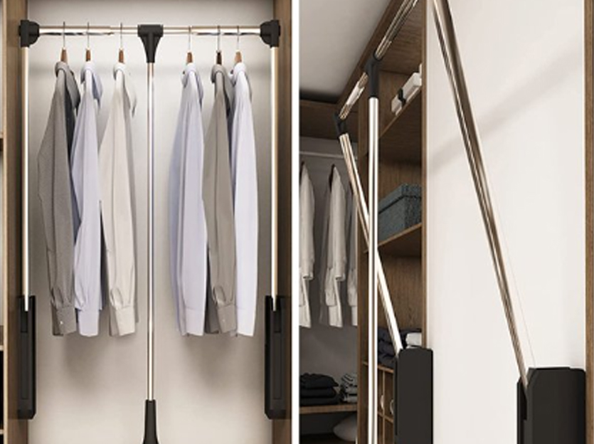 Make the best use of space vertically. The space above is usually left and unseen. We can create an elegant shelves or cabinets that extend from floor to ceiling. We can keep full heighted wardrobes. These options will create additional storage space while keeping the floor area free. There are few hardware fittings are available that would help to access the space that is above 7 feet, like use of Hanger Lift in wardrobe, that would help to create almost twice as much space for hanging the clothes.