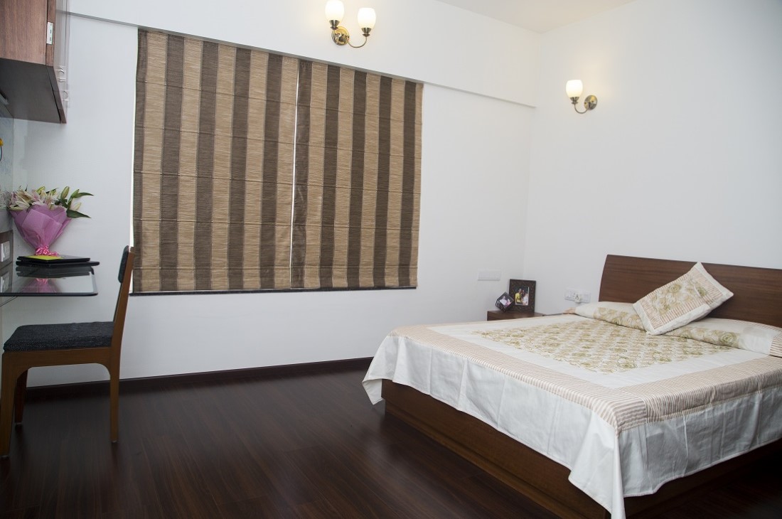 Mehta couple wanted their house very simple with minimalistic interiors straight lines and they wanted to have a wooden flavour in their house so that’s the reason they chose Veneers and wooden shade laminates, the prime designing element in their interiors. This project involved some civil work like demolition of kitchen platform and rebuilding of kitchen it to match their requirement as they wanted to install dishwasher, washing machine and various other appliances in the kitchen itself as they merged their utility gallery with the kitchen. In this project we even added a few teak wood components like corner bookshelves, dining table, coffee table with recliner chairs in their living balcony. To decorate balcony our team used Sherwood ceiling with the PU polishing that looks like wooden plank fixed ceiling, along with various type of lighting so that they can have ambient lighting in their balcony. This couple had a typical requirement like they wanted to create walk in wardrobes they wanted to have elaborate storage in bathrooms as well they were very particular about the upholstery or the quality of upholstery, they were interested in. Family keeps on travelling internationally so they wanted to have a loft which can accommodate their large travelling bags, so we had to create special storage considering the measurements of their large travelling bags.