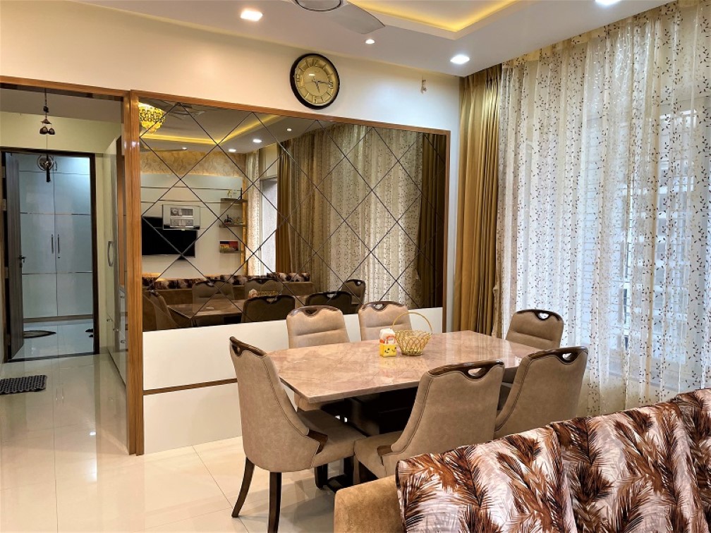 In living room, we considered bronze mirror panelling in a diamond shape, so several pieces of mirrors were cut into diamond shape and paste on the panelling to create illusion of depth especially near dining table.