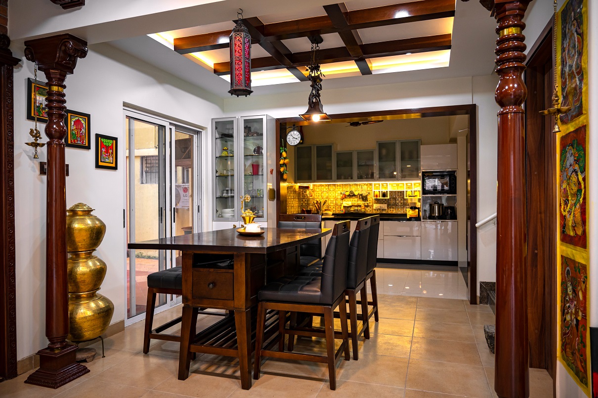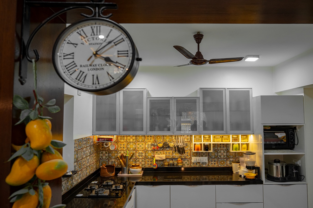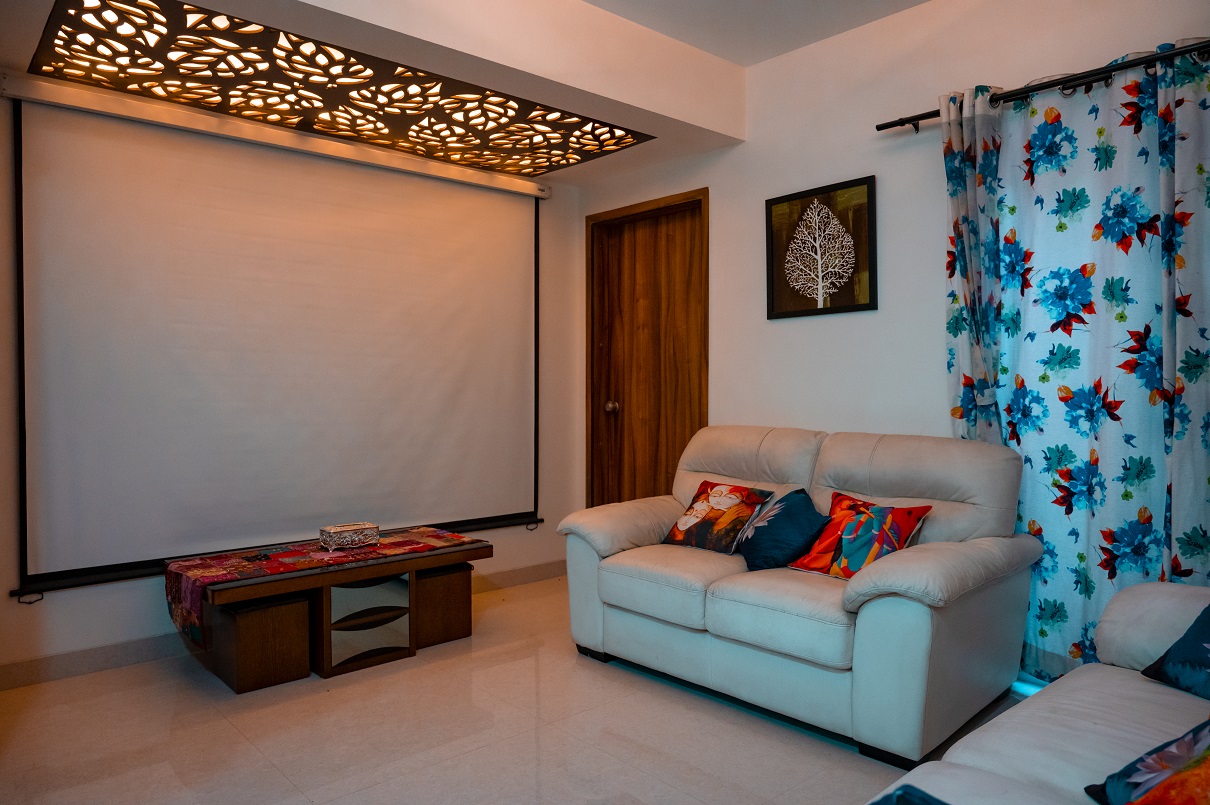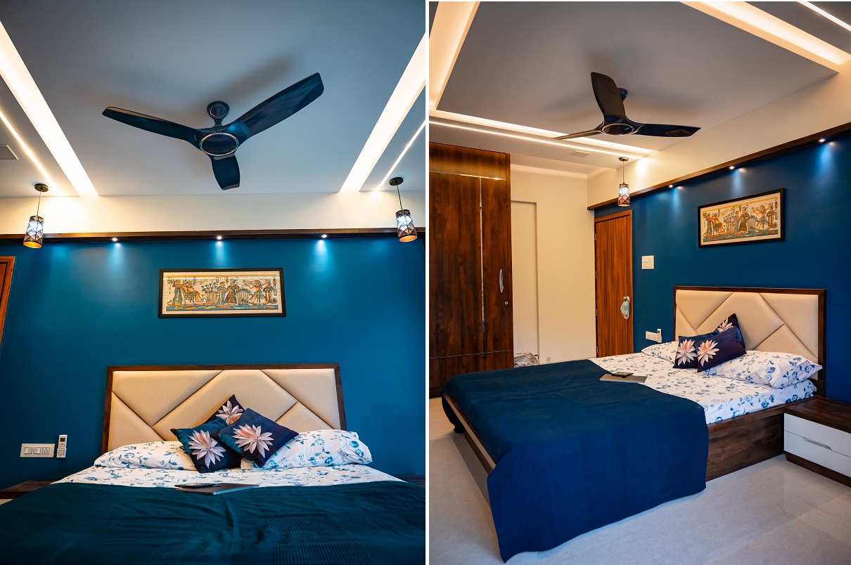 The Patil family specifically sought an interior design firm with a strong track record in working with teak wood and veneers, particularly in crafting innovative designs for their kitchen and pooja space. They had a clear vision of completing the project within a specified budget while incorporating unique false ceiling designs that could accommodate various types of lighting, including focus lighting, ambient lighting, functional lighting, and mood lighting.