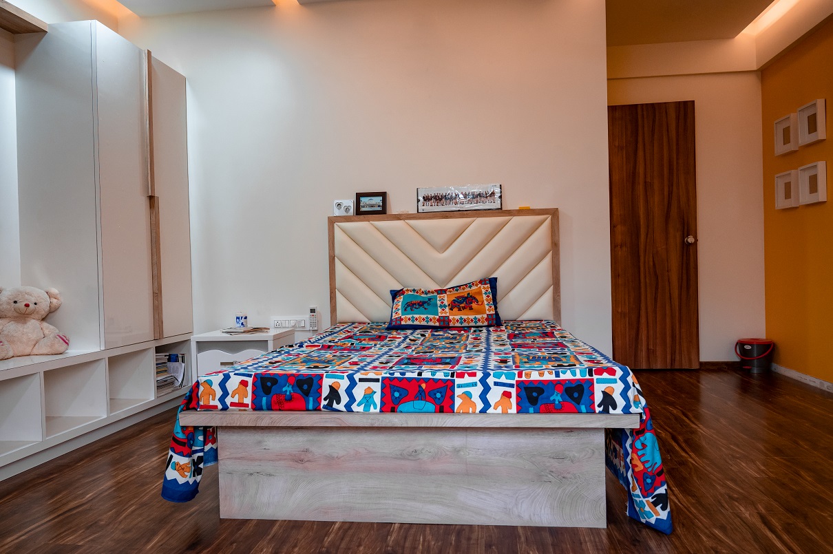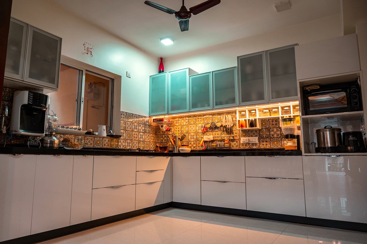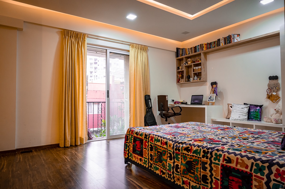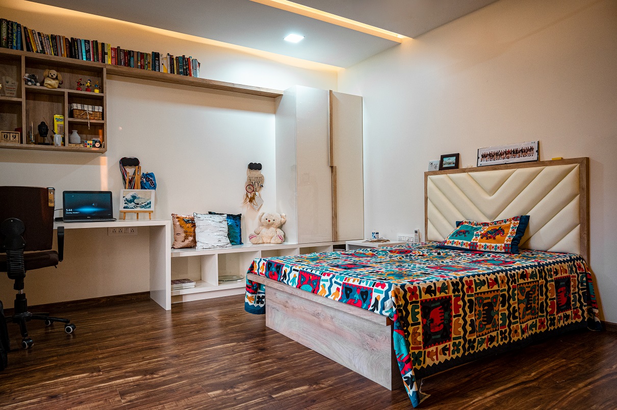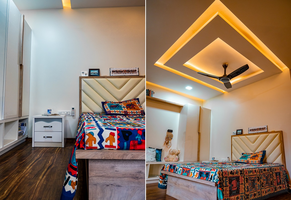 The Patil family specifically sought an interior design firm with a strong track record in working with teak wood and veneers, particularly in crafting innovative designs for their kitchen and pooja space. They had a clear vision of completing the project within a specified budget while incorporating unique false ceiling designs that could accommodate various types of lighting, including focus lighting, ambient lighting, functional lighting, and mood lighting.